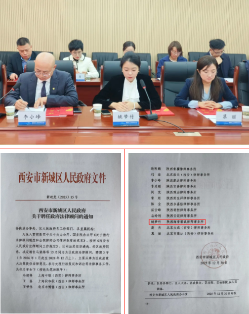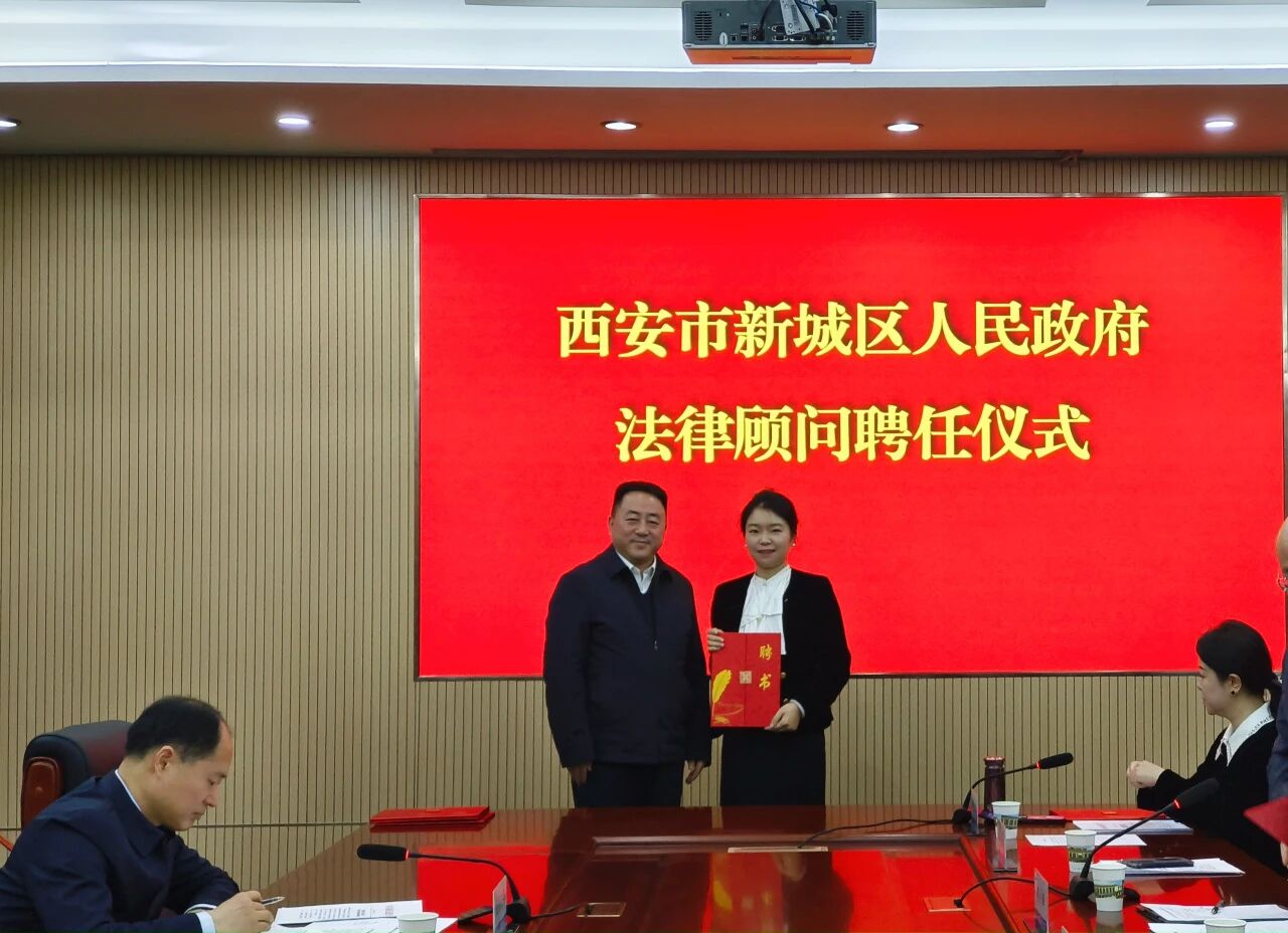 2026年1月14日,新城区人民政府举行新一届政府法律顾问聘任仪式,新城区副区长、公安分局党委书记、局长李西安,区司法局局长郭满鸿等相关领导出席仪式。我所合伙人姚梦竹律师凭借深厚的专业素养、丰富的政府法律服务经验,受聘为区政府法律顾问,聘期三年,任期自2026年1月起至2028年12月止。